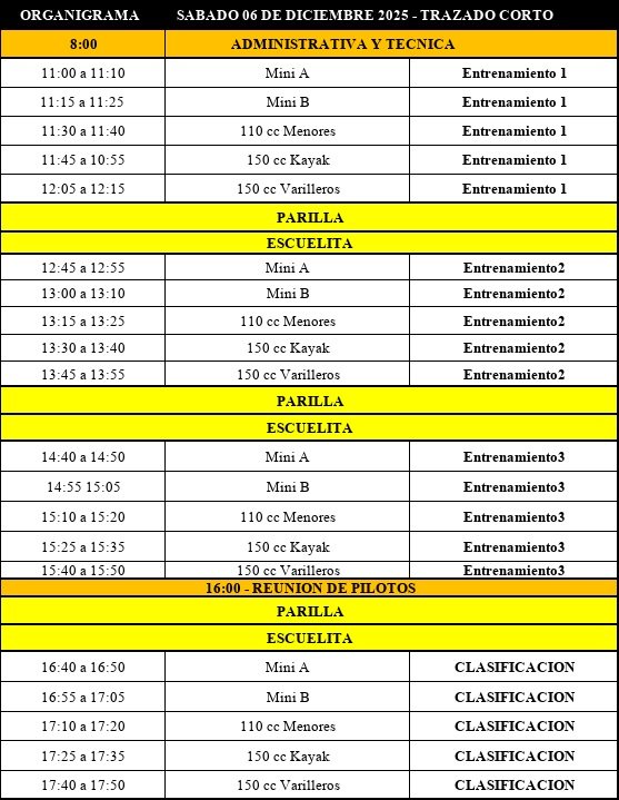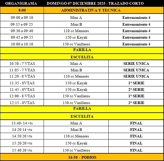 Según el cronograma oficial, la actividad comenzará este sábado a las 11:00 con las tandas de entrenamiento. Hacia las 16:40 se desarrollarán las clasificaciones, mientras que el domingo se disputarán las series y finales desde las 10:50.