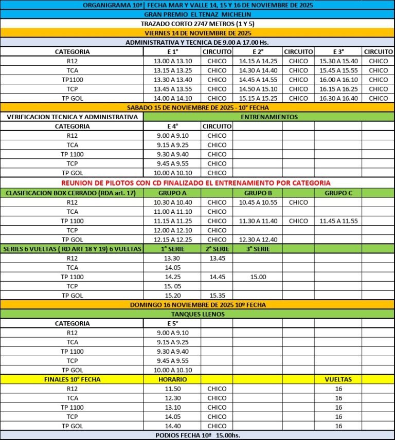 Para esta oportunidad la Asociación Mar y Valle determinó que el dibujo elegido será el chico de 2.747 mts de extensión, con las curvas número 1 y 5. La fecha entregará puntaje y medio para las series y finales, por lo que las matemáticas indican que debemos esperar hasta la última vuelta, para confirmar a los nuevos campeones. Serán 15 los pilotos, entre las cinco categorías, que irán en búsqueda de la tan ansiada corona.